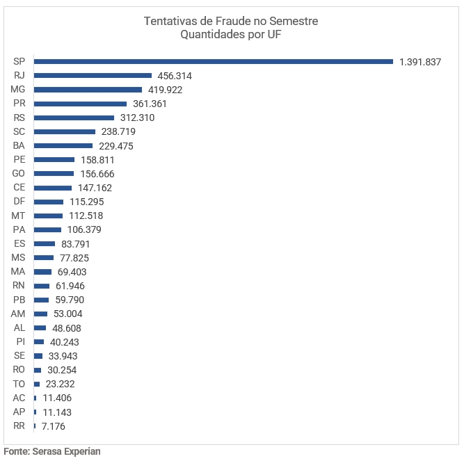Na visão por Unidades Federativas (UFs), São Paulo, Rio de Janeiro e Minas Gerais lideraram o ranking com mais registros de tentativas de fraude entre janeiro e junho deste ano. Em seguida, estavam todos os estados do Sul. Caio Rocha explica que os criminosos tendem a focar em áreas com maior volume de transações financeiras. Confira, a seguir, a listagem completa com as quantidades: