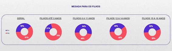 Entre os pais que dão mesada aos filhos, o costume é maior para a faixa de crianças de 6 a 11 anos (54%), seguido pela faixa etária de 15 a 18 anos (45%). A maioria dos genitores adota a tradicional frequência mensal (62%).