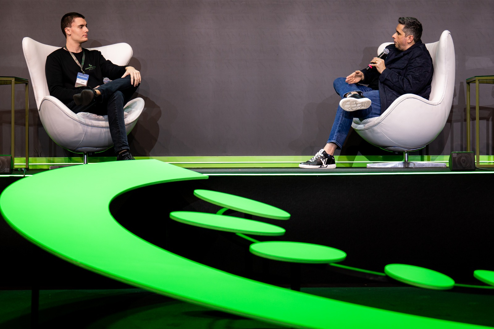 Foto: Artur de Oliveira Ribas (Co-fundador da Kiwify) ao lado de Flávio Augusto (Fundador do Grupo Wiser), durante hotseat no evento Kiwify Festival 2023
