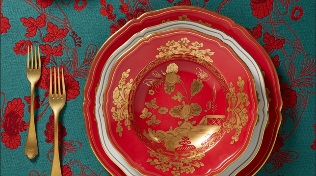 A combinação das cores verde, vermelho e dourado na mesa posta é uma escolha clássica e sofisticada que transcende o tempo. O vermelho transmite calor e paixão à mesa, evocando sentimentos de celebração e alegria. Seja em guardanapos, arranjos florais ou detalhes nas louças, o vermelho combinado ao verde sempre será uma aposta certeira para o Natal. Destaque da mesa para as louças da coleção Oriente Italiano Gold, da 6F, de porcelana, com detalhes feitos à mão em ouro.