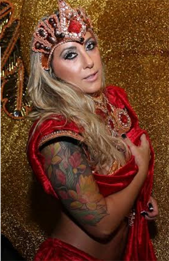 A beldade vai desfilar com uma fantasia ousada e muito luxuosa, repleta de brilho e pedrarias bordadas. O figurino nas cores dourada e vermelha promete exibir as curvas definidas da loira, que já avisou: “vou entrar na avenida com pouca roupa”. Para não estragar a surpresa, Silvia Waszak posou no barracão da escola com uma capa de camurça na cor vinho.
