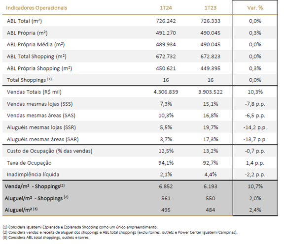 “Como aconteceu ao longo de 2023, nos primeiros meses do ano a performance de vendas da Iguatemi cresceu 8,7 p.p. acima da média do setor, segundo dados da ABRASCE. Isso mostra a força da nossa marca e a qualidade do portfólio da Iguatemi, composto por ativos bem posicionados nos segmentos de renda mais resilientes às adversidades econômicas”, comenta Guido Oliveira, CFO da Companhia. Para ilustrar o bom desempenho do indicador, as vendas mesmas áreas (SAS) cresceram 10,3% no trimestre, acima das vendas mesmas lojas (SSS), que tiveram alta de 7,3% sobre um ano antes – o que comprova o efeito positivo da qualificação do mix de lojas sobre a produtividade da área bruta locável (ABL) da empresa.