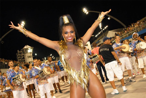 Usando uma fantasia bem decotada, com pedrarias bordadas e muito brilho, Valeska abusou da transparência e apareceu com o cabelo solto, apenas com um adereço dourado. A modelo deu um show à parte, levantando o público que acompanhava o desfile nas arquibancadas.
