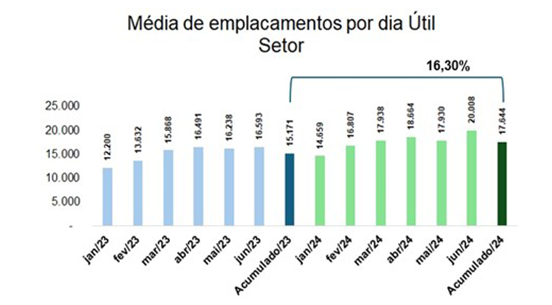 Os emplacamentos de veículos refletiram o impacto do crédito mais abundante e melhor índice de confiança por parte dos consumidores e empresários, apresentando alta, tanto em junho como no acumulado do 1º. Semestre de 2024.