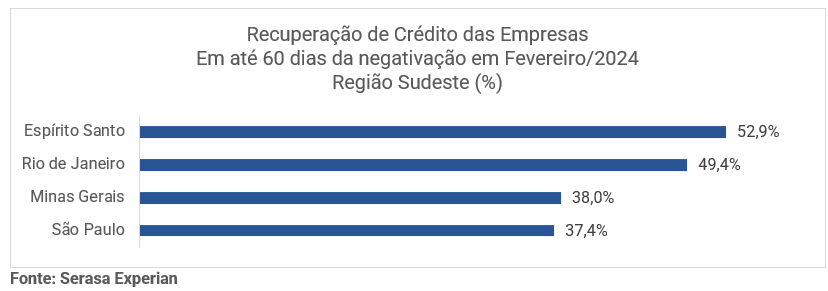 Os dados do Indicador de Recuperação de Crédito das Empresas da Serasa Experian mostraram que, no Sudeste do país, do acumulado de dívidas das companhias que foram negativadas em fevereiro deste ano, 4 em cada 10 (40,1%) foram pagas ou renegociadas em até 60 dias. O Espírito Santo registrou o maior percentual de pagamentos da localidade (52,9%). Confira, no gráfico abaixo, os detalhes das Unidades Federativas (UFs) da região: