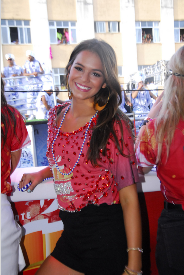 A combinação não poderia ter sido mais perfeita: a bela morena foi presenteada com uma chuva de colares. Seguindo o ritual dos “gandhys”, que trocam colares por beijos, a atriz pegava os colares jogados e retribuía jogando beijos no ar. Feliz, conversava e ria com as amigas a cada novo instante do Carnaval baiano que descobria.