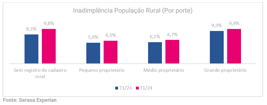 No cenário Brasil, os dados mostram que durante o primeiro trimestre de 2024, ainda considerando apenas dívidas que venceram por mais de 180 dias e que foram contraídas em setores que se relacionam às principais atividades do agronegócio, a inadimplência atingiu somente 7,3% da população rural que atua como pessoa física no Brasil. Um aumento sutil de 0,8 pontos percentuais em relação aos três primeiros meses de 2023.
