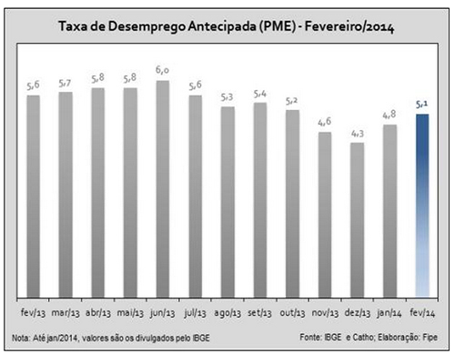 A taxa de desemprego de fevereiro medida pela PME/IBGE deve ficar em 5,1%, segundo a projeção Catho-Fipe. Esse valor, apesar de maior do que o registrado em janeiro (4,8%), é 0.5 ponto percentual menor do que o do mesmo mês de 2013. Se confirmado, será o menor valor para o mês de fevereiro desde o início da série histórica (2002).