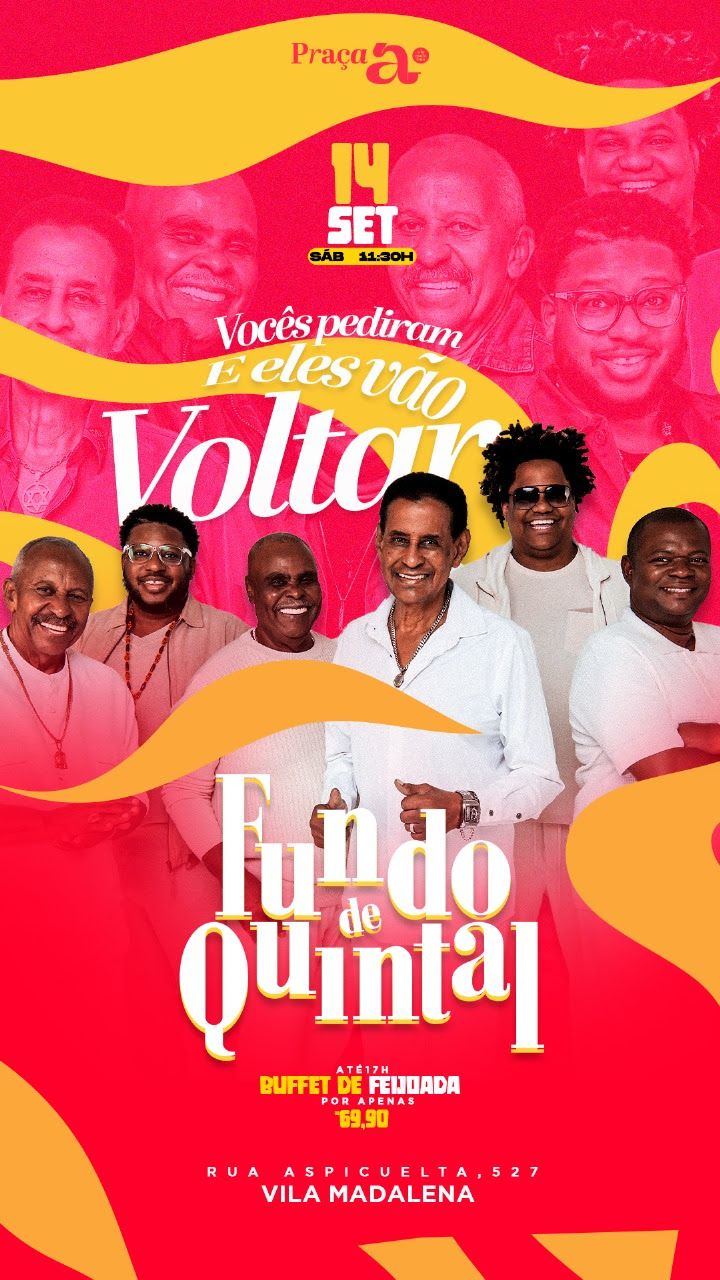 Quem não perde a oportunidade de curtir samba e pagode de altíssimo nível já pode reservar o sábado,14 de setembro, na agenda! Na ocasião, a Praça A – casa que segue o conceito de SuperBar e é reconhecida como espaço que vai ‘do chope ao show’, com música ao vivo e gastronomia de alta qualidade – recebe o grupo Fundo de Quintal, reconhecidamente um dos mais tradicionais, importantes e respeitados grupos que o samba e o pagode já viram em ação, para mais um mega show!