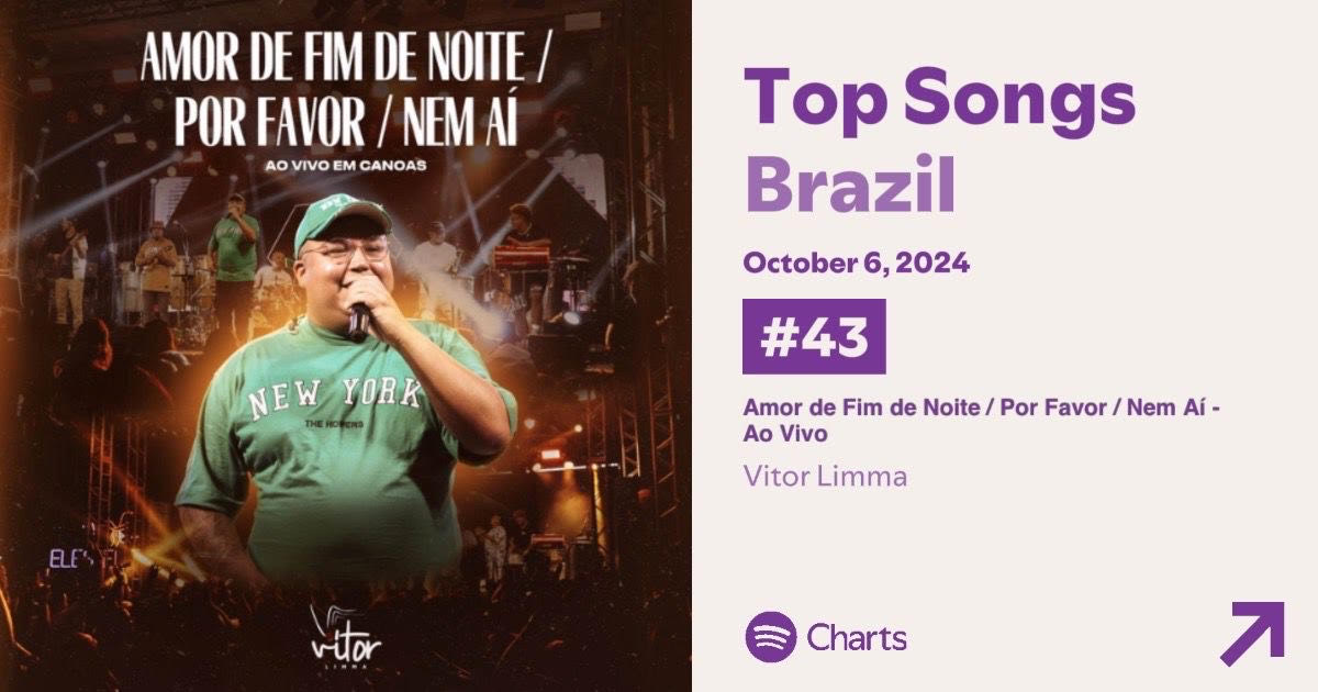 O cantor Vitor Limma continua colhendo os frutos de seu sucesso com o pout-pourri “Amor de Fim de Noite / Por Favor / Nem Aí - Ao Vivo em Canoas”, que permaneceu no Top 50 do Spotify Brasil durante todo o último fim de semana, alcançando a 43ª posição. A faixa já ultrapassou 25 milhões de reproduções na plataforma, e o videoclipe ao vivo acumula mais de 10 milhões de visualizações no YouTube, confirmando a força de seu trabalho.