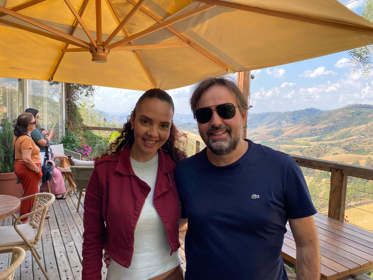 Amanda Djabraian e Godi Júnior na sacada do Restaurante Shangri-La em Serra Negra |