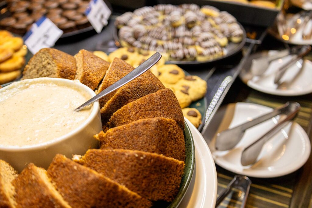 Servido diariamente, o café da manhã do hotel conta com um buffet completo que inclui seleção de frutas e frios, variedade de pães doces e salgados, bolos com cobertura à parte, iogurtes, cereais, ovos mexidos, pão de queijo e waffles, além de bebidas quentes e frias. Há ainda itens funcionais, veganos e com zero lactose.