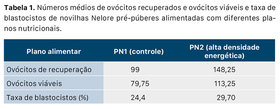 Os animais que receberam a dieta do PN2 apresentaram 49% a mais de ovócitos recuperados que os animais do PN1, além de 42% mais viáveis. A taxa de produção de embriões foi 21% superior – a taxa de blastocistos em D7 (estágio de desenvolvimento do embrião sete dias após a fecundação) foi de 24,4% para PN1 e de 29,7 para PN2. (Ver Tabela 1) Além disso, aos 12 meses e meio de idade, as novilhas sob o PN2 tinham maior peso médio (321 kg contra 309 kg) e melhor acabamento de carcaça.