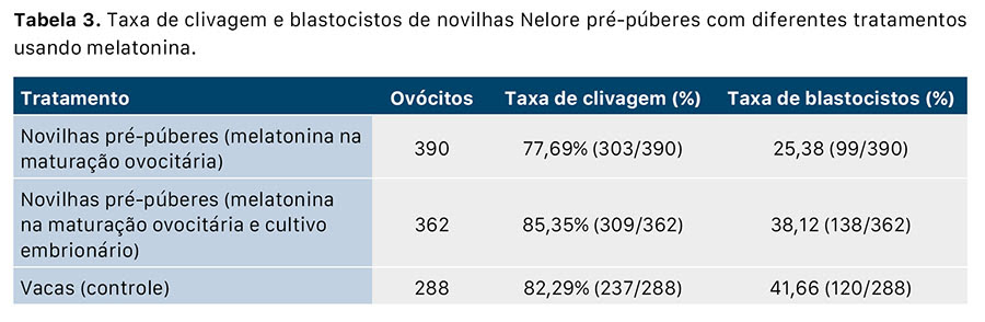 Para avaliar o benefício do uso da melatonina na competência ovocitária e na produção de embriões, os ovócitos recuperados foram divididos em três grupos: apenas ovócitos de novilhas pré-puberes maturados in vitro com melatonina; ovócitos de novilhas pré-púberes maturados com melatonina e embriões cultivados com melatonina; e ovócitos de vacas adultas com histórico conhecido de produção de embriões in vitro, cultivados sem melatonina (controle). Foram comparadas as taxas de clivagem (percentual de ovócitos com divisões celulares após a fecundação) e de blastocistos em D7.