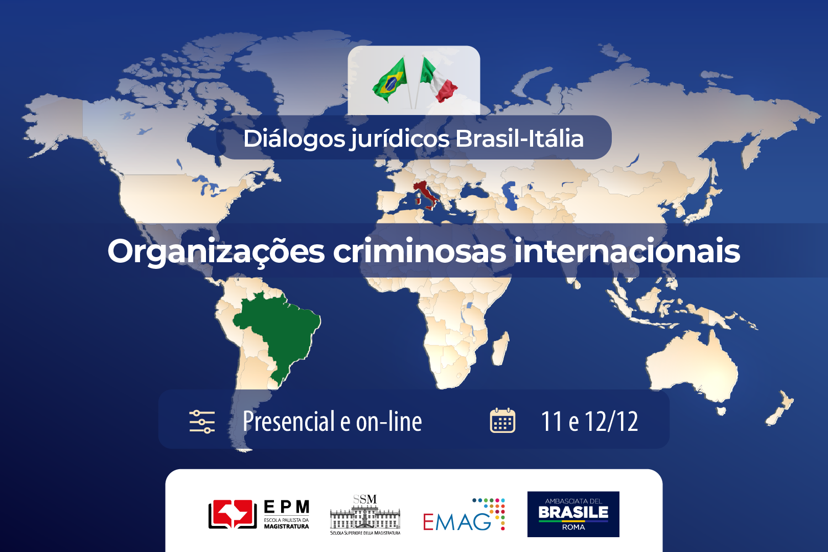 A Escola Paulista da Magistratura (EPM), em parceria com a Escola de Magistrados do Tribunal Regional Federal da 3ª Região (Emag) e a Scuola Superiore della Magistratura della Repubblica Italiana (SSM), com o apoio da Embaixada do Brasil na Itália, promoverá nos dias 11 e 12 de dezembro o seminário Organizações criminosas internacionais, sob a coordenação do desembargador José Maria Câmara Junior, do desembargador federal Nino Oliveira Toldo, do magistrado Roberto Giovanni Conti e do advogado Federico Vianelli.