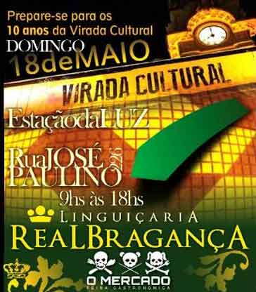 Neste domingo, dia 18, a Virada Cultural, de São Paulo, vai celebrar seus 10 anos com boa gastronomia e brinde com Chuva de Prata sem álcool. Uma das mais tradicionais marcas de bebidas para comemoração dos brasileiros faz parte do cardápio preparado especialmente para a ocasião pela Linguiçaria Real Bragança, um dos 33 restaurantes participantes da feira gastronômica, "O Mercado", uma das atrações da maratona cultural e que acontece na Estação da Luz, na região central da cidade.