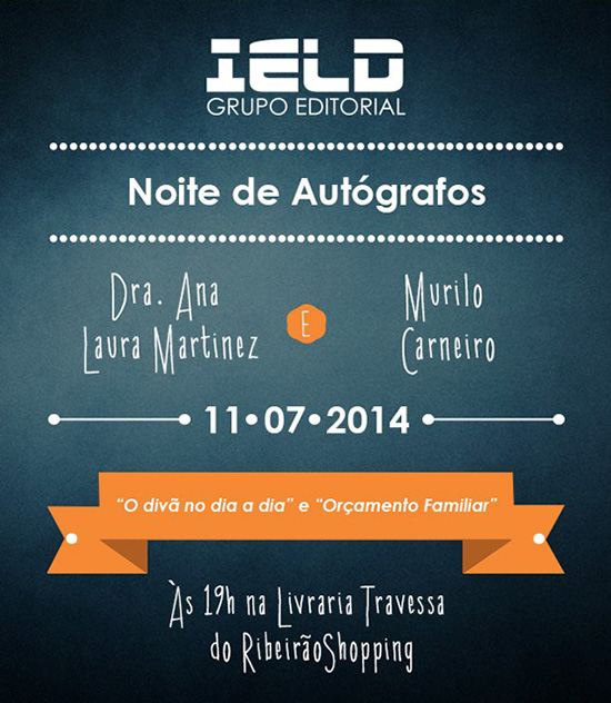 Nesta sexta-feira, 11 de julho, acontece na Livraria Travessa do RibeirãoShopping, a partir das 19 horas, uma noite especial, onde os autores Murilo Carneiro e Ana Laura Martinez autografarão seus livros “Orçamento familiar” e “O divã no dia a dia”, respectivamente. Ambos os títulos publicados pela editora e que são um sucesso entre os leitores mais assíduos dos temas.