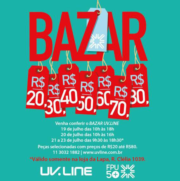 Entre os dias 19 e 23 de Julho/14 a UV.LINE realiza seu tradicional bazar na loja da marca no bairro da Lapa, em São Paulo. Com preços especiais, que variam de 20 a 80 reais, peças com proteção solar FPU 50+ selecionadas como saídas de praia, chapéus, camisetas e outros artigos femininos, masculinos e infantis estarão à venda com possibilidade de pagamentos em dinheiro ou nos cartões de débito e crédito Visa, Mastercard e Diners.