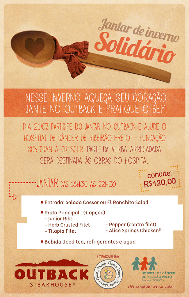 O Hospital de Câncer de Ribeirão Preto – Fundação SOBECCan, em parceria com o Outback, realiza hoje ,21, o Jantar de Inverno Solidário. A ação, que une solidariedade e o que há de melhor em culinária, terá parte da verba arrecadada destinada às obras do hospital.