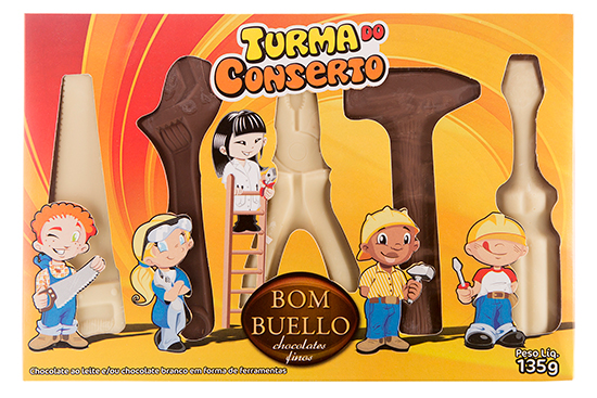 Já para os meninos, a Turma do Concerto é ideal para estimular a brincadeira e a criatividade. São 5 unidades de chocolate em formato de ferramentas, nos sabores branco e ao leite. A embalagem de 135 gramas, além de colorida, exibe o produto, estimulando ainda mais o paladar.