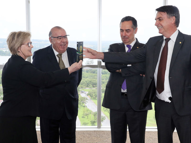 | Gesto, aparentemente inocente, soou como uma verdadeira advertência, esta no sentido de que a Carta Magna fosse lida e fielmente observada (Foto: TSE/Fotos Públicas) |