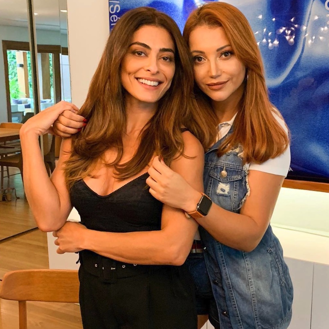 | Cintia Fortes em seu salão de beleza com uma de suas clientes famosas, a atriz Juliana Paes |