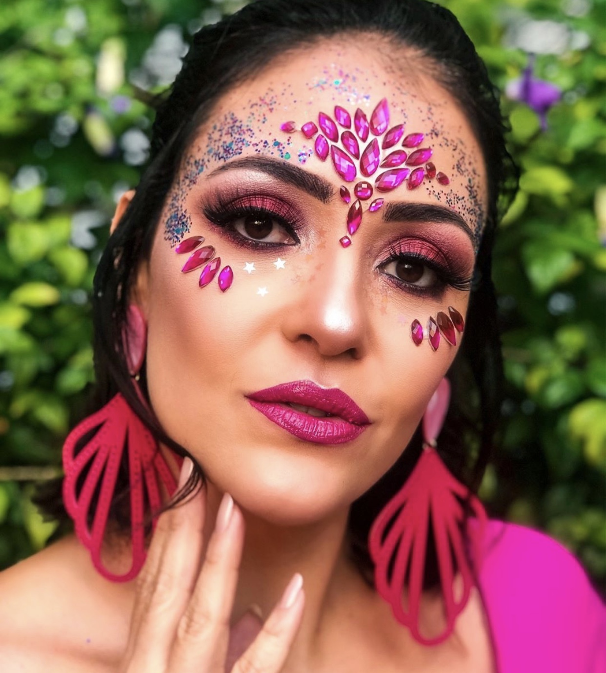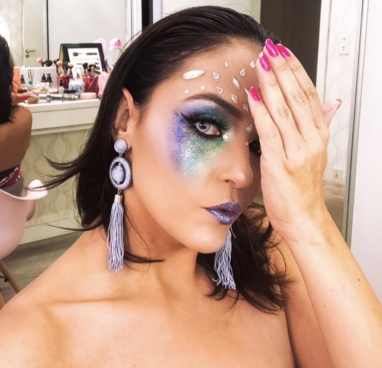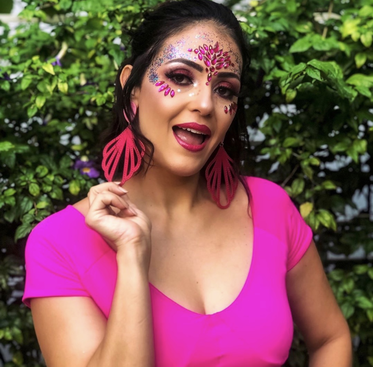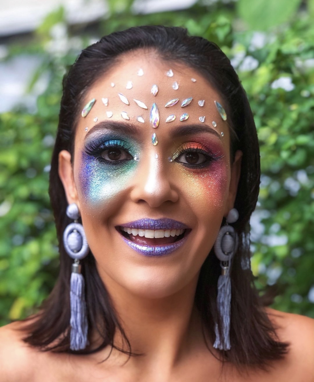 "Começo preparando a pele com um bom primer usei o da Beyoung. Depois entramos com a base e no carnaval prefiro usar uma mais leve, muito calor e sol pra ela não derreter selo muito bem essa base com pó usei um da Payot que eu amo. E vamos para o olho, um Olhão colorido e com Glitter já da o efeito para o carnaval e venho colando as pedrarias e depois glitter muito glitter pq amamos brilhar ainda mais no carnaval" explicou a makeup artist.