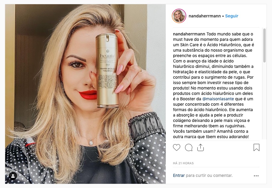 "Todo mundo sabe que o must have do momento para quem adora um Skin Care é o Ácido Hialurônico, que é uma substância do nosso organismo que preenche os espaços entre as células. Com o avanço da idade o ácido hialurônico diminui, diminuindo também a hidratação e elasticidade da pele, o que contribui para o surgimento de rugas. Por isso sempre bom investir nesse tipo de produto! No momento estou usando dois produtos com ácido hialurônico um deles é o Booster da @maisonlasante que é um super concentrado com 4 diferentes formas do ácido hialurônico. Ele aumenta a absorção e ajuda a pele a produzir colágeno deixando a pele mais viçosa e firme melhorando tbem as ruguinhas. Vocês também usam? Amanhã conto a outra marca que tbem estou adorando! #ficadica" compartilhou Fernanda Herrmann que alerta para sempre consultar um dermatologista para tirar todas as dúvidas.