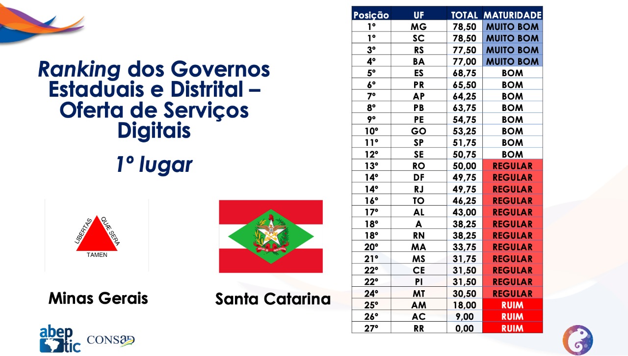 Minas Gerais e Santa Catarina se destacam na avaliação geral de Oferta de Serviços Digitais, que compila as três dimensões de avaliação do estudo. Bahia e Rio Grande do Sul estão em 1°lugar dentro da dimensão: Capacidades para a oferta digital de serviços. Santa Catarina e Paraíba ocupam a primeira posição no item oferta de Serviços Digitais e, por último, o Rio Grande do Sul lidera a pontuação no item Regulamentação sobre modernização para a Oferta de Serviços Públicos.
