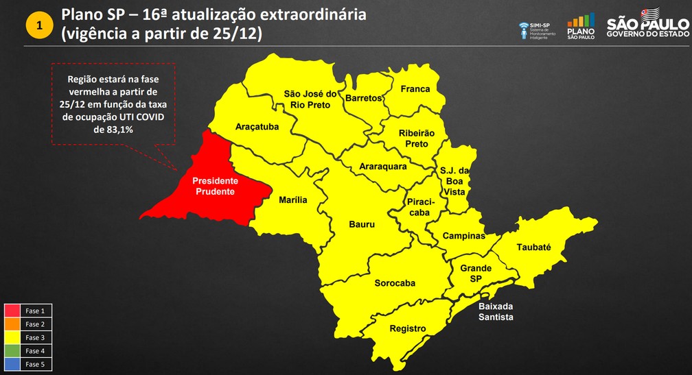 Nos outros dias fora do período de natal e ano novo o estado segue na fase amarela do Plano SP, com exceção de Presidente Prudente, no interior, que ultrapassou 80% da lotação de UTIs e ficará na fase vermelha até o anúncio de uma reclassificação.