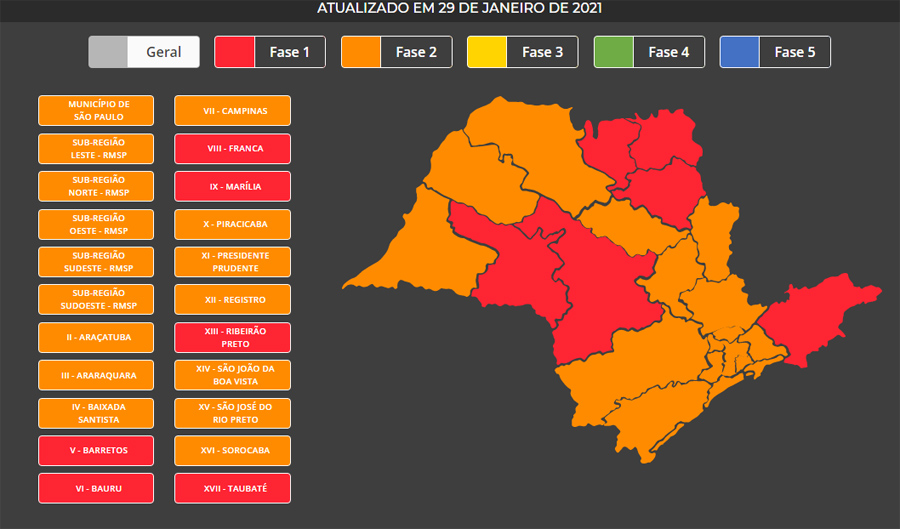 As medidas vão vigorar até o dia 7 de fevereiro. Até lá, nenhuma região poderá avançar às fases amarela e verde, as mais flexíveis em relação ao atendimento presencial.