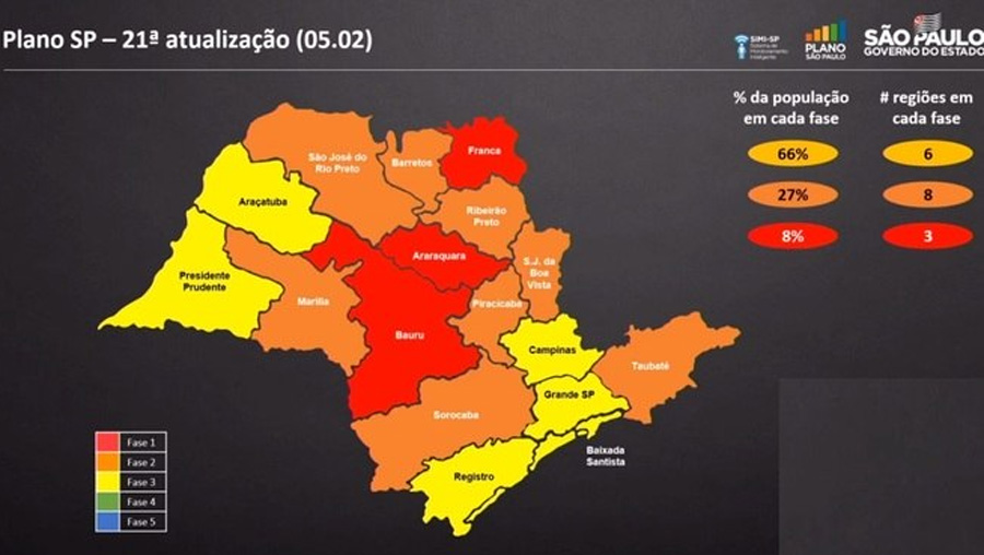 Com a queda no número de internações pela terceira semana consecutiva e a abertura de novos leitos hospitalares, dez regiões do Estado avançam para fases menos restritivas e uma regride para a etapa vermelha, com regras mais severas. A mudança foi anunciada nesta sexta-feira (5) pelo governo na 21ª reclassificação do Plano São Paulo, que estabelece regras para a retomada das atividades econômicas. As regiões que avançaram de fase da fase laranja para amarela são Região Metropolitana, Registro, Araçatuba, Baixada Santista, Presidente Prudente e Campinas. De acordo com a secretária de desenvolvimento econômico, Patrícia Ellen, houve melhoria também nas regiões Barretos, Ribeirão Preto, Marília e Taubaté - que passaram da fase vermelha para a laranja. Araraquara regride para a fase vermelha.