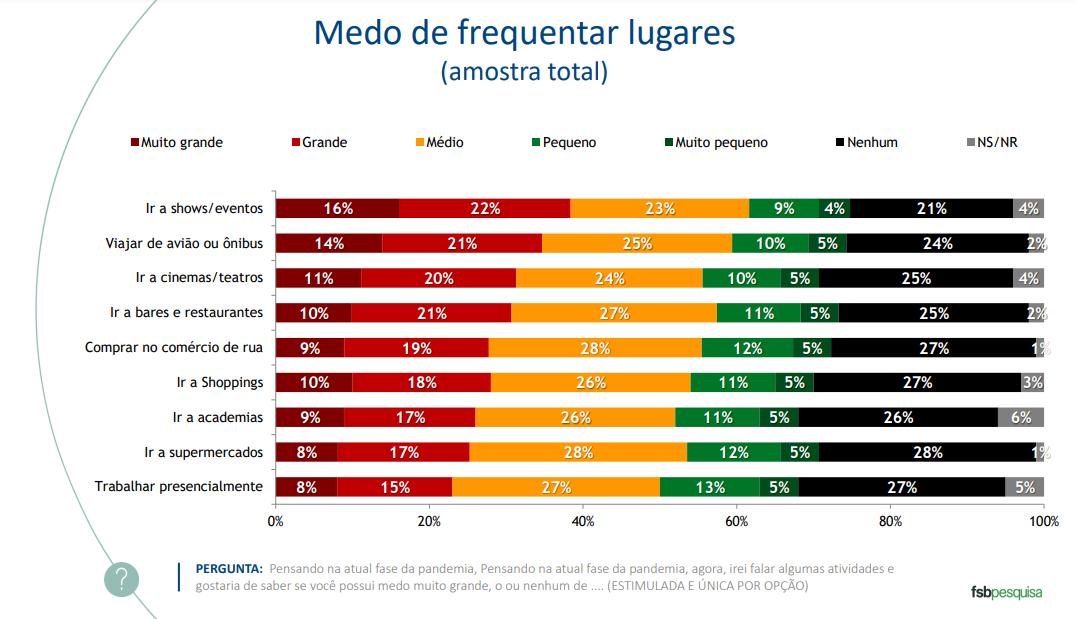 As pessoas que não receberam nenhuma dose de vacina são aquelas que têm menos medo de frequentar lugares público. Enquanto 65% dos brasileiros totalmente imunizados têm algum temor de ir a shows e eventos, o percentual cai para 39% entre aqueles que não tomaram nenhuma dose do imunizante. No geral, essa é a atividade que mais desperta algum tipo de temor entre os entrevistados, considerando imunizados ou não. Sessenta e um por cento deles afirmam que têm medo muito grande (16%), grande (22%) ou médio (23%) de ir a shows ou eventos. O trabalho presencial é a atividade que menos assusta os entrevistados: 23% afirmam que têm medo muito grande (8%) ou grande (15%) e 27% dizem que o medo é médio.