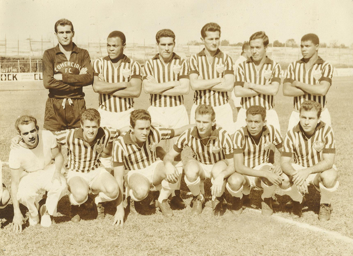 | A equipe do Comercial de Ribeirão Preto em 1966. Da esquerda para a direita: Rosan, Píter, Jorge, Nonô, Amaury e Ferreira. Agachados: o massagista Glostora, Peixinho, Luiz Cai-Cai, Paulo Bin, Jair Bala e Carlos César | Foto: Arquivo pessoal |