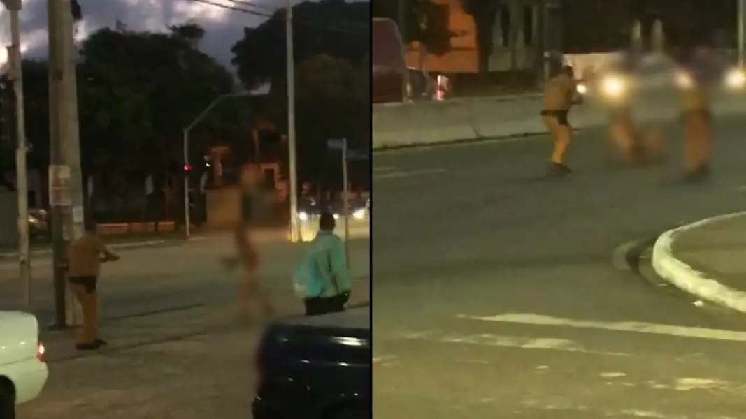 | O homem foi baleado no momento em que, pelado, foi em direção a equipe com a faca em mãos. | Foto: Reprodução/ RICtv |