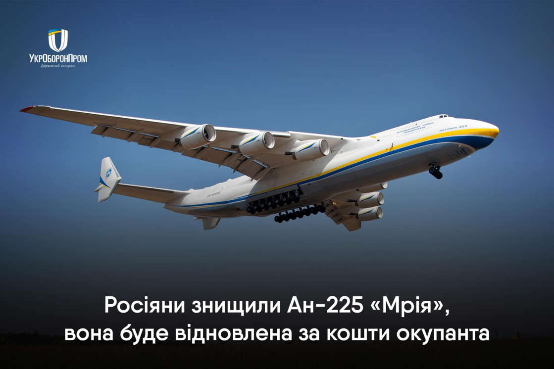The biggest plane in the world "Mriya" (The Dream) was destroyed by Russian occupants on an airfield near Kyiv. We will rebuild the plane. We will fulfill our dream of a strong, free, and democratic Ukraine. pic.twitter.com/Gy6DN8E1VR