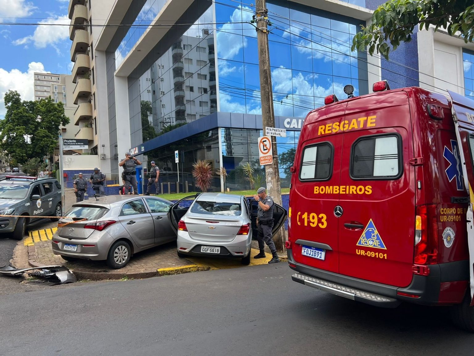 HB20 seguido pela PM avançou a sinalização de pare e bateu no cruzamento das ruas Prudente de Morais e Álvares Cabral