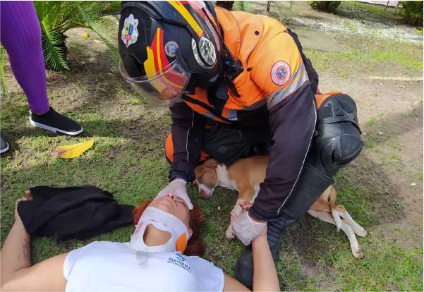 | Após o acidente de moto, a cachorra ficou deitada ao lado da motociclista enquanto ela recebia socorro médico | Foto: Corpo de Bombeiros / Divulgação |