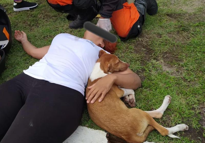 | Cão ficou ao lado da motociclista durante todo o procedimento | Foto: Corpo de Bombeiros/ Divulgação |