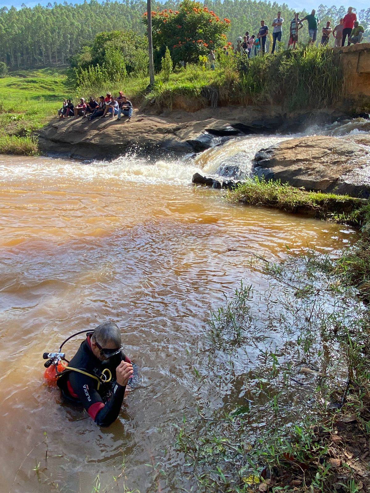 Os bombeiros foram acionados e compareceram ao local, e foram informados que o corpo do homem já havia sido encontrado e liberado pela perícia da Polícia Civil. Os militares então iniciaram as buscas pela mulher.