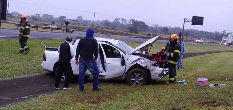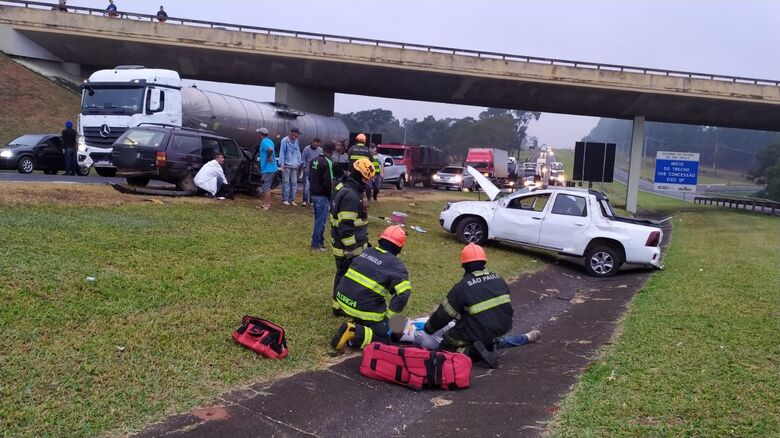 A Quantum rodou no asfalto e foi parar no canteiro central, enquanto que a Oroch capotou várias vezes e também se imobilizou no canteiro central da SP-310.