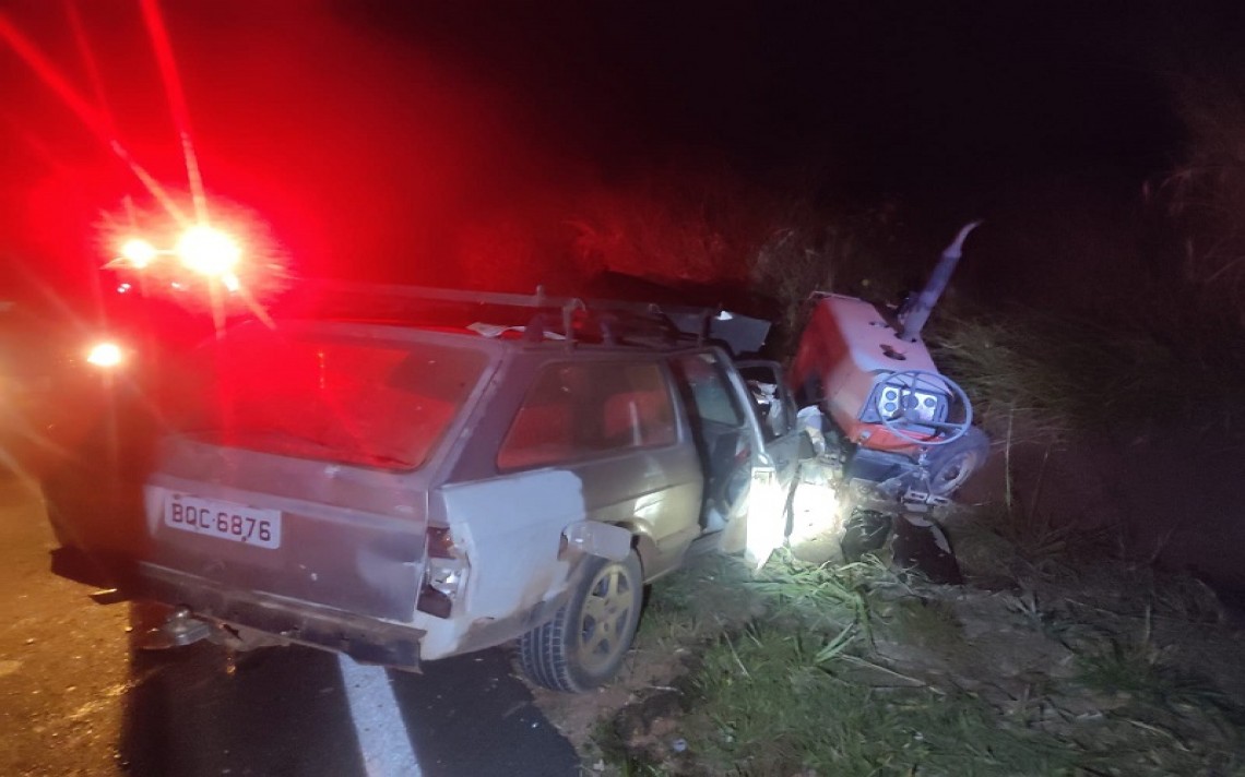 Com o impacto da batida, o trator partiu ao meio. Segundo informações da Polícia Civil, o motorista do carro disse que seguia pela pista, quando se distraiu e bateu na traseira do trator.