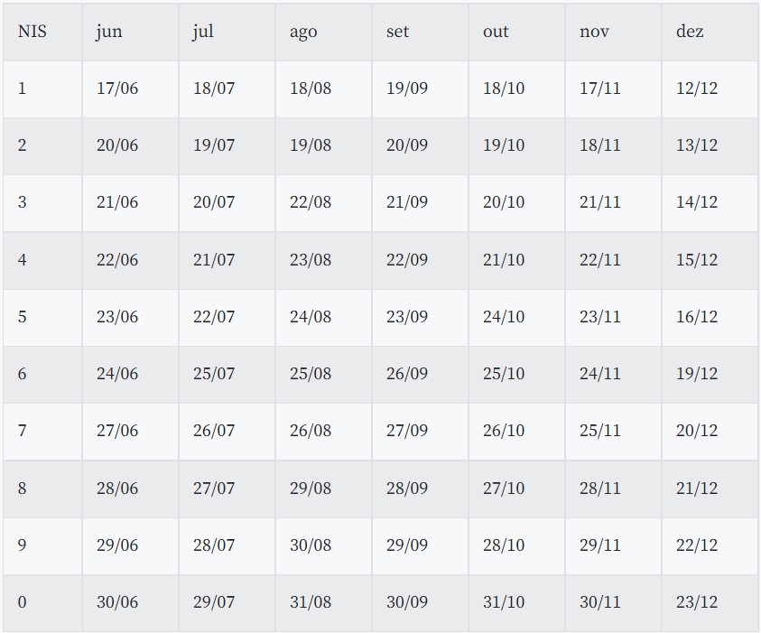 Calendário de pagamento: