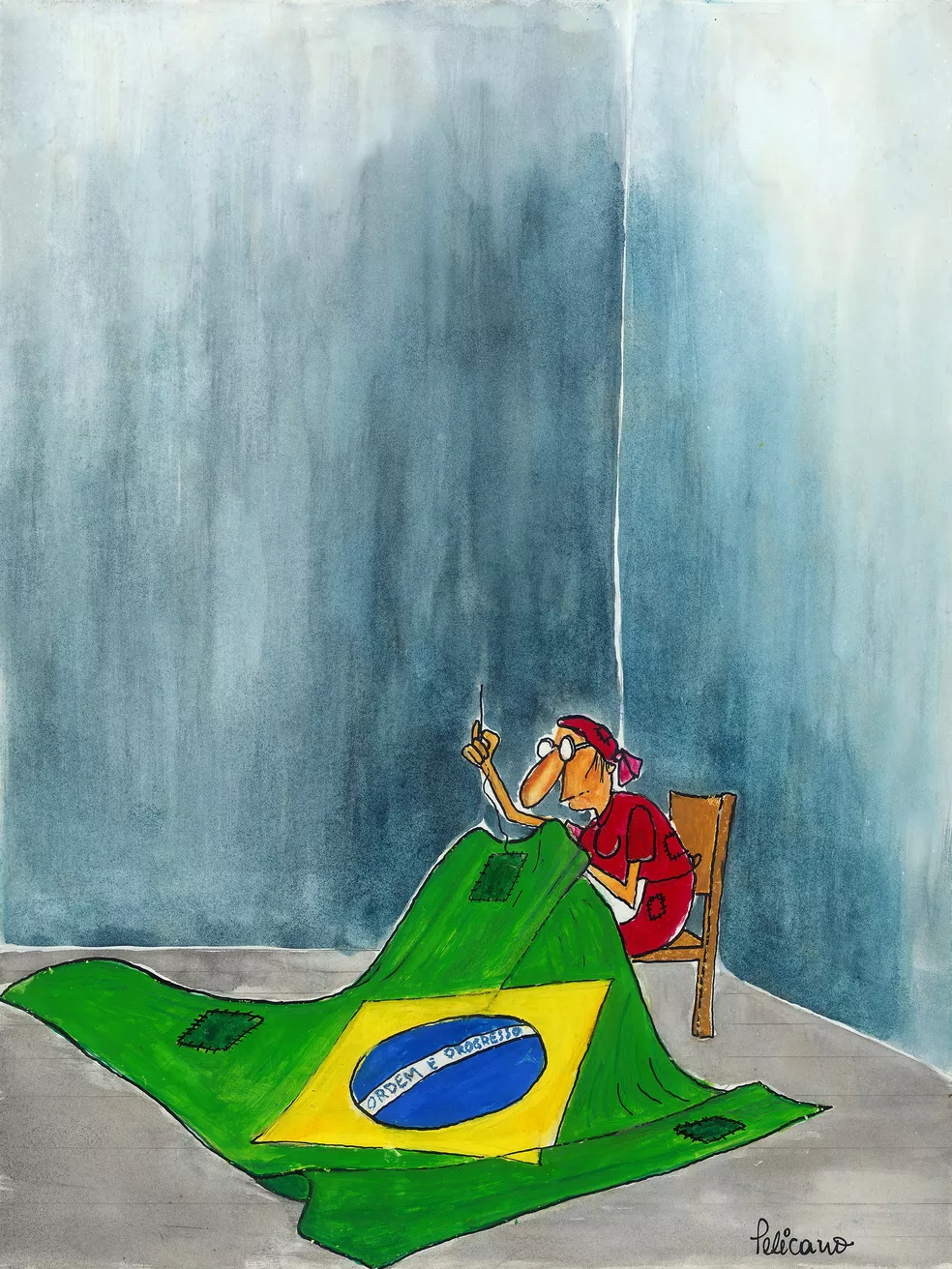 | Ilustração de Pelicano Vilas Boas sobre o regime militar exposta no 8º Salão do Humor de Piracicaba, em 1981| Foto: César Augusto Vilas Boas |