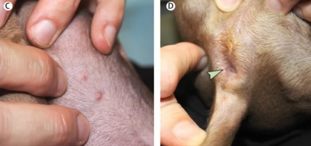 | Fotos publicadas no estudo mostram as erupções cutâneas na barriga e na região anal do cachorro | Foto: Divulgação/The Lancet |