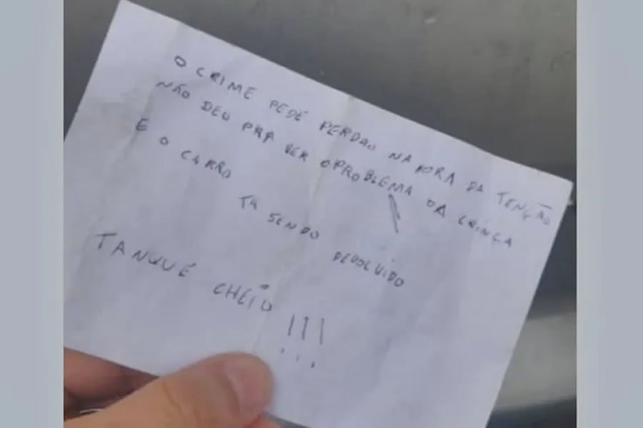 “O crime pede perdão, na hora da tensão não deu para ver o problema da criança, e o carro está sendo devolvido”, dizia o bilhete. No interior do veículo também estava a cadeira de roda usada para locomoção do filho da proprietária do veículo, um menino de 4 anos que tem deficiência motora, devido a uma encefalite.
