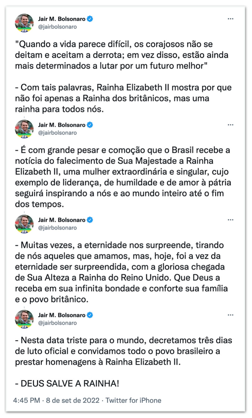 Nas redes sociais, outras autoridades brasileiras manifestaram pesar pela morte da monarca britânica, que foi a mais longeva rainha da histórica da Coroa. "Em nome do Congresso Nacional brasileiro, presto condolências à família e a todo o povo do Reino Unido", escreveu o presidente do Senado, Rodrigo Pacheco.