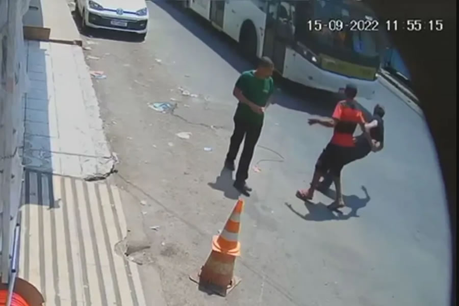 As imagens mostram os dois caminhando pela rua, quando o ônibus se aproximou e o agressor empurrou o irmão na frente do transporte coletivo. A vítima foi atingida pelo veículo, mas por sorte o motorista conseguiu frear.