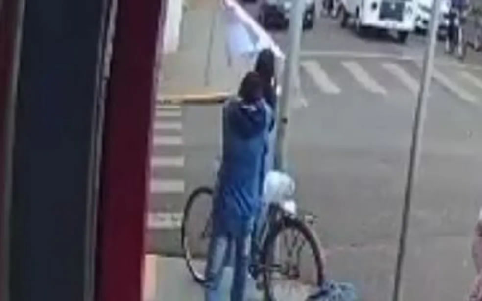 A vítima, de 29 anos, cai gravemente ferida na calçada. As imagens ainda mostram o susto de moradores que estavam nas esquinas por causa do barulho do tiro.