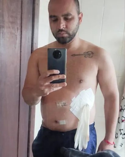 “O médico falou que era medicina de guerra e colocou uma luva improvisando o procedimento. Saí do hospital com aquela luva pendurada na barriga, vazando muito. Em casa eu não tinha controle. Fiquei encharcado de secreção”, informou o paciente.
